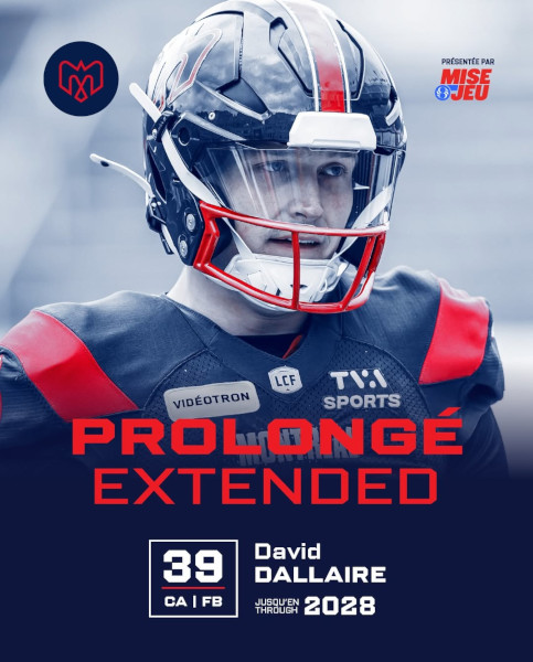 Les Alouettes de Montréal ont annoncé lundi avoir signé un contrat de trois saisons avec le centre-arrière québécois David Dallaire, qui sera lié avec l’équipe jusqu’à la fin de la campagne 2028.