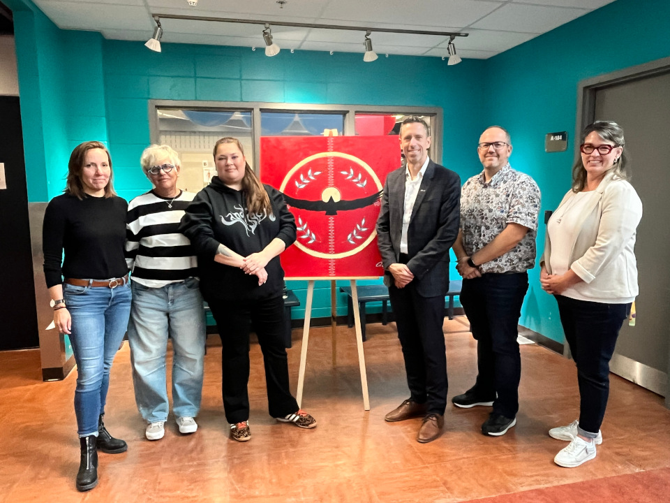 De gauche à droite : Joëlle Champoux-Bouchard, enseignante en Techniques de travail social ; Chantal Bisaillon, enseignante en Techniques de travail social ; Eruoma Awashish, artiste ; Sébastien Piché, directeur du Cégep à Terrebonne ; Nicolas Forest, directeur adjoint au Service de l’organisation et du cheminement scolaires ; et Isabelle Pelletier, directrice adjointe.