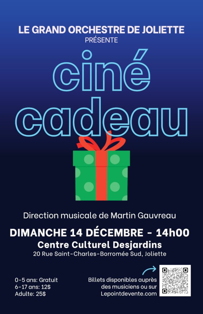 Sous la direction musicale de Martin Gauvreau, le Grand Orchestre de Joliette présente un concert de Noël titré « Ciné-Cadeau », le dimanche 14 décembre à 14h00 au Centre culturel Desjardins à Joliette.