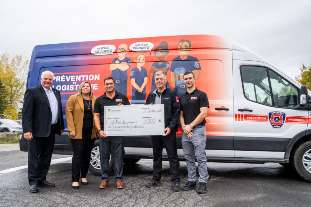 En présence de Mme Valérie Doyon, présidente de la Commission de la sécurité publique, de M. Érick Harnois, directeur adjoint du Service de sécurité incendie de Terrebonne et de pompiers, M. Serge Sochodolsky, président de la Fondation, a accepté les fonds avec une grande reconnaissance.