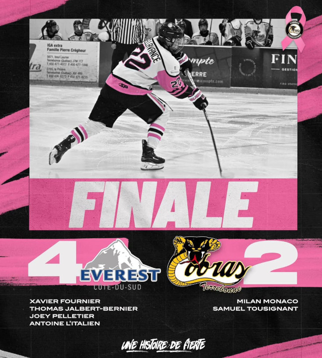 Les Cobras de Terrebonne ont affronté L’Everest de la Côte-du-Sud lors de leur match thématique contre le cancer du sein à la Cité du sport. Malgré tous leurs efforts, l’équipe s’est inclinée par la marque de 2 à 4.